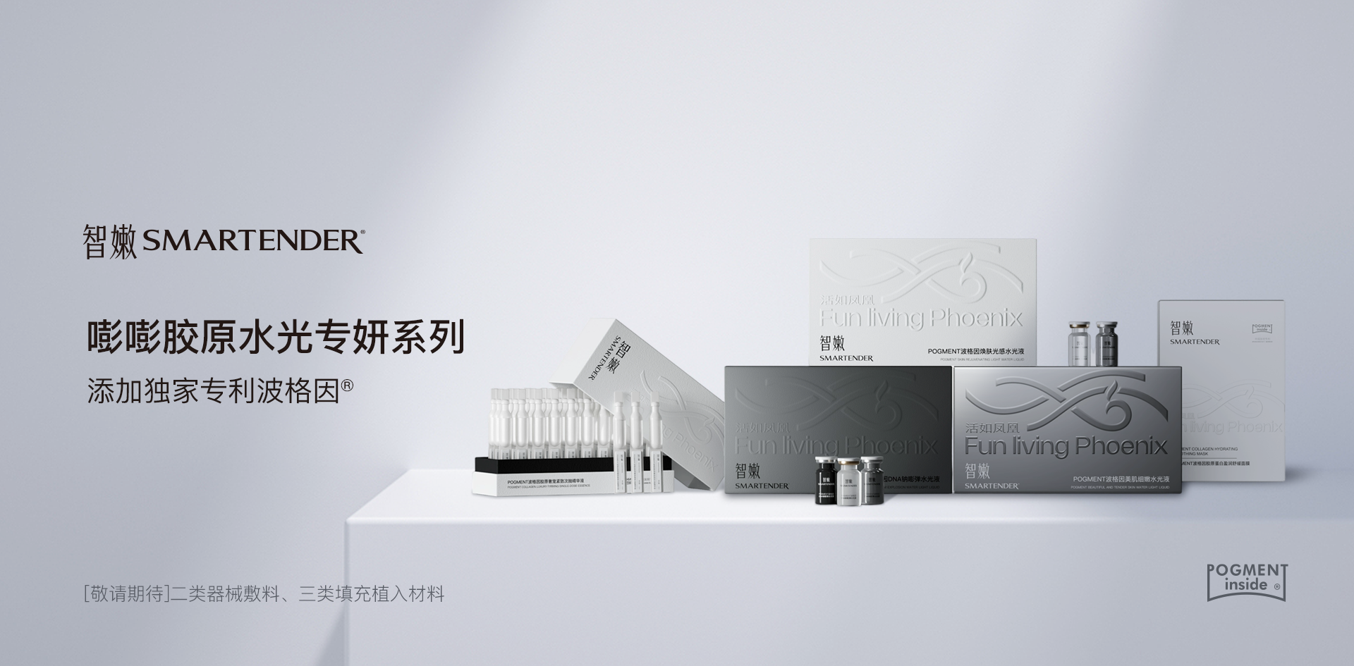 其产品管线涵盖了嘭嘭HOME胶原水光:智嫩3号(主打保湿修复)、智嫩2号(主打美白提亮)、智嫩1号(主打抗皱紧致)。智嫩「嘭嘭棒」次抛精华、智嫩「高膜王」修复敷料。同时,智嫩的二类器械敷料与三类填充材料研发也在同步推进中